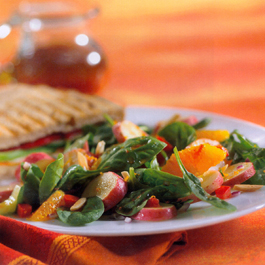 2. Toss the spinach leaves with some of the vinaigrette and place them on salad plates. 3. Dress the rest of the ingredients with some of the remaining vinaigrette (there may be some vinaigrette left over, depending on how heavily you like to dress your salads) and place atop the spinach. Makes 6 servings. Nutritional information:
